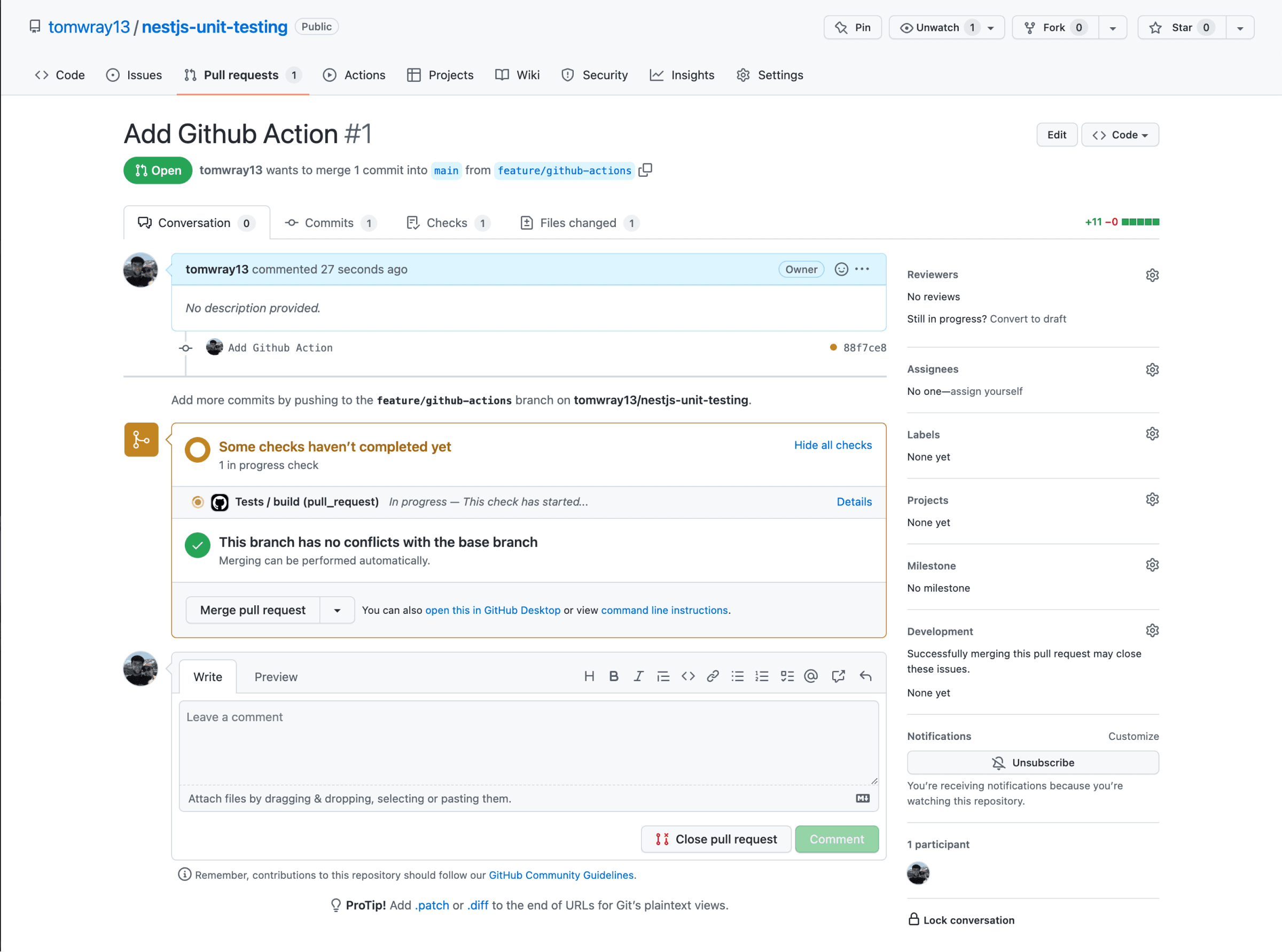 If you now push up your code to Github and open a pull request, you'll see the test is automatically run and you can see if they've passed inside the Pull Request: